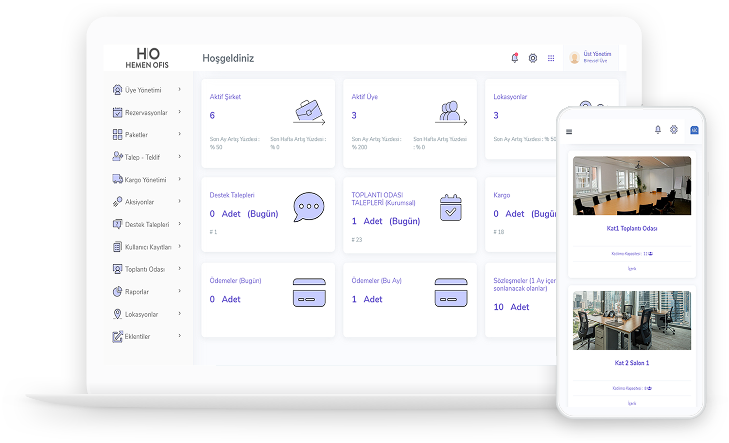 Tek bir platform ve ekran üzerinden üye, sözleşme ve ödemeler, rezervasyonlar, hizmet/alan işlemlerini çok hızlı ve kolay bir şekilde her yerden yönetebilirsiniz.